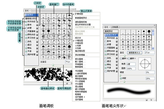 在實際繪圖時,經常需要設計一些符合當前繪畫要求的畫筆,或是對當前所選的預設畫筆進行高級修改,這時都需要使用到畫筆調板。單擊工具選欄右側的 (切換畫筆調板)按鈕,也可以執行菜單命令“窗口/畫筆”(快捷鍵<F5>),均可彈出畫筆調板。
