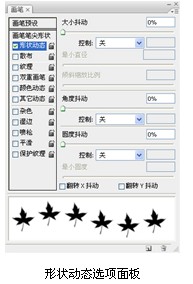 單擊選擇畫筆設置項中的“形狀動態”,形狀動態面板中的選項決定畫筆筆跡的隨機變化,可使畫筆粗細、角度、圓度等呈現動態變化,如圖所示。