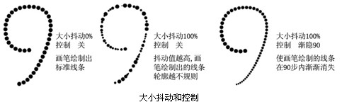控制:在下拉列表中選擇以何種方式控制動態遠素的變化。共包括5個選項,關(不控制抖動)、漸隱(在指定步長數內控制抖動),如果安裝了手寫筆等數字化設備,還可通過鋼筆壓力、鋼筆斜度和光筆輪控制抖動。