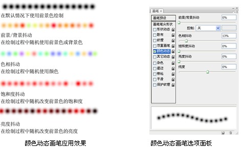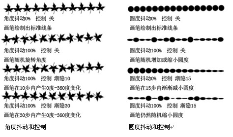 抖動:根據百分比值確定相關動態元素的隨機程度。值為0%時,在畫筆繪制過程中元素不發生變化,值為100%,畫筆繪制時動態元素具有最大的自由隨機度。