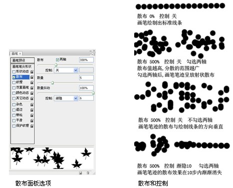 1) 散布和控制:指定畫筆在繪制線條的過程中,筆跡的分散程度,如圖所示。