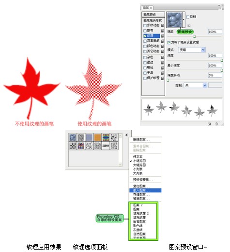 注意:在畫筆中添加紋理不會改變畫筆的顏色,畫筆的顏色仍由前景色控制,紋理僅改變前景色的明暗強度。