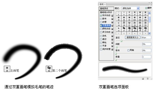 使兩個畫筆疊加混合在一起繪制線條。在畫筆調板的“畫筆筆尖形狀”面板中設置主畫筆,在“雙重畫筆”面板中選擇并設置第二個畫筆,第二個畫筆被應用在主畫筆中,繪制時使用兩個畫筆的交叉區域,如圖所示。“雙重畫筆”選項面板如圖所示。