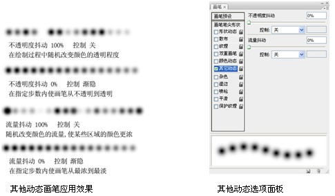 設置畫筆在繪制線條的過程中,顏色的不透明度和流量,如圖5-37所示。“其他動態”選項面板如圖所示。