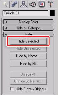 (1) 在建立鋼筆帽之前進入Display(顯示)面板,然后單擊Hide Selected按鈕,把剛才的鋼筆中心物體隱藏起來,準備制作鋼筆帽模型,如圖1-4。
