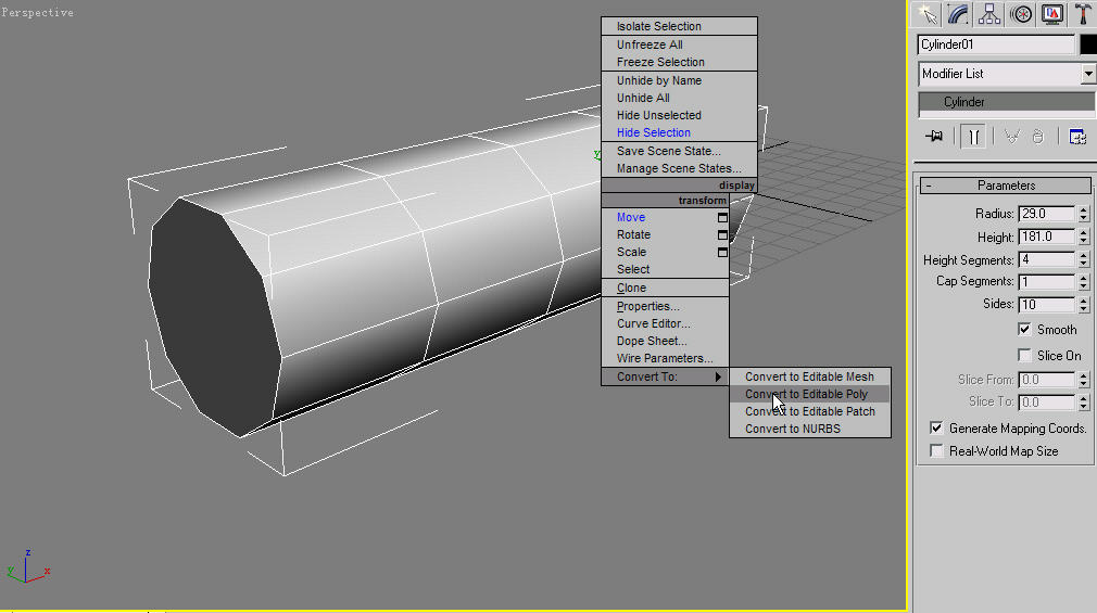 (2) 然后在Left(左)視圖建立一個新的Cylinder(圓柱)物體,建立完成后回到Perspective(透視)圖中,設置圓柱體的Radius(半徑)數值為29,Height(高)數值為181,然后Height Segments(高度段數)為4,Cap Segments(端面段數)為1,Sides(邊緣段數)為10。建立圓柱物體完成后回到Perspective(透視)圖中,在圓柱物體上單擊鼠標右鍵,然后在彈出的快捷菜單中選擇Convert to(轉換為)>Convert to Editable Poly(轉換塌陷為可編輯多邊形)命令,將圓柱體轉化成Edit Poly的編輯模式,如圖1-5所示