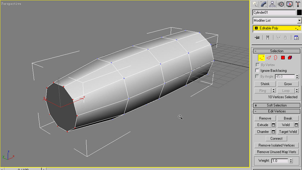 (3) EditPoly(可編輯多邊形)命令中選擇Vertex(點)的編輯模式,然后再選擇鋼筆帽頭處輪廓半徑的Vertex(點),接著用縮放工具調節鋼筆帽的輪廓形狀,調節縮放的效果,如圖1-6。