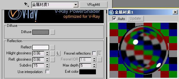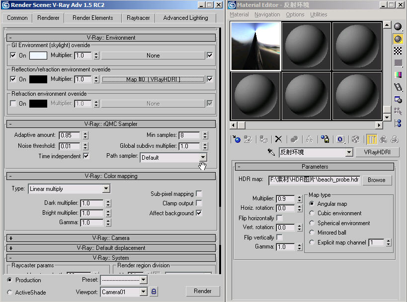 (5)觀察渲染的效果,發現金屬材質一片漆黑。這是什么原因呢?經過分析,原來是我們沒有為場景增加相應的環境,因此金屬反射默認的環境色黑色才導致如此結果。沒問題,找到了原因之后我們來為場景環境添加一張VRAY HDRI貼圖作為環境即可,環境貼圖用戶可自行設定,這里我給出參考設置,如圖1-6所示。