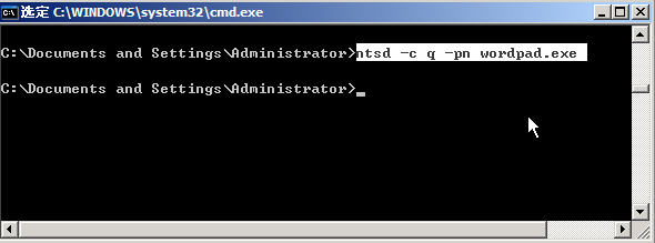 命令一:ntsd -c q -pn 進程名,這里進程名表示wordpad.exe。所以套用一下后,在命令提示符后輸入ntsd -c q -pn wordpad.exe即可關閉寫字板進程,如圖1-3所示,大家在輸入命令時一定要注意空格的輸入。至于命令的具體含義請參考DOS中的命令提示,在此不再多說。