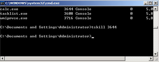 然后我們在命令提示符后輸入:tskill “進程PID”命令。其中進程PID值為3644,所以最終命令輸入為: tskill 3644即可關閉,如圖1-5所示。