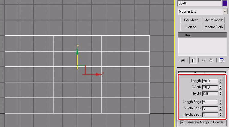 (1) 首先在Create(創建)面板Standard Primitives(標準幾何體)中選擇Box(長方體)物體,然后在Front(前)視圖建立出Box(長方體)物體,Box(長方體)物體的Length(長)為50,Width(寬)為100,Height(高)為0,內部Length Segs(長度段數)為5,Width Segs(寬度段數)為3,Height Segs(高度段數)為1,如圖4-1。