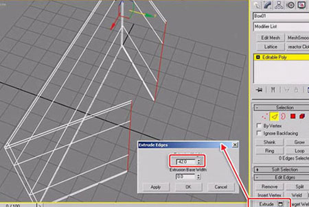 (4) 回到Perspective(透視)圖中,選擇邊緣的兩組線,點擊Edit Poly (編輯多邊形)命令中的Extrude(擠壓)命令,得到了兩組新的面。Extrude(擠壓)命令Extrusion Height(擠出高度)的具體數值是-42,如圖4-4。