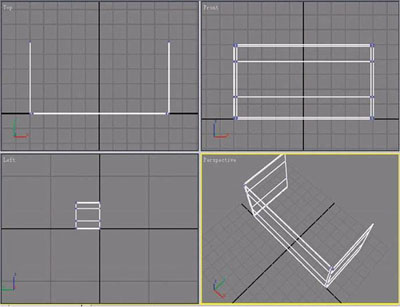 (5) 選擇Edit Poly(編輯多邊形)命令中的Vertex(點),把剛Extrude(擠壓)的兩組新面做位置上的調整,調整的和初始創建面成90度角。一個簡單的三面墻體就制作出來了,如圖4-5所示。