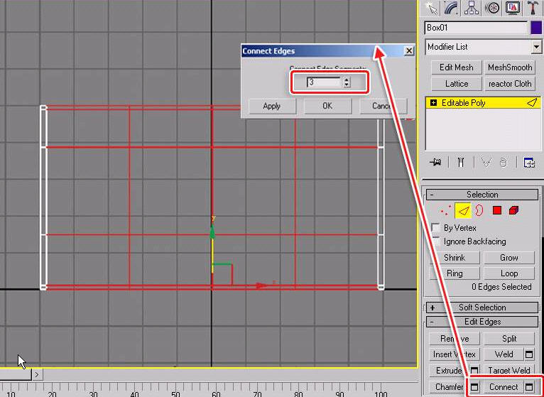 (6) 選擇前面的橫線,用Connect(連接)命令加入3條線。Connect(連接)命令主要用于創建新的邊,如圖4-6所示。