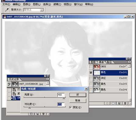 2、選青色通道,將對比度調(diào)小,亮度調(diào)大。人的皮膚色即可出來。不滿意的話又可采用其它手段再調(diào)調(diào)。