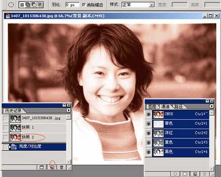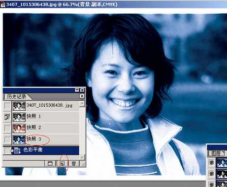 6、點快照2 ,恢復(fù)到橘黃色畫面,現(xiàn)在利用歷史畫筆,畫頭發(fā),點藍(lán)色快照最左邊空格,就可開始了。在大塊面歷史畫筆的筆頭選大點,不透明度也大點。在交接部位筆頭選小點,不透明度也小點。你馬上可以感受到快照和歷史畫筆的功效了。(在這里頭發(fā)是偏藍(lán)的,你可說成其它的)背景是利用綠色快照,原理和這一樣。
