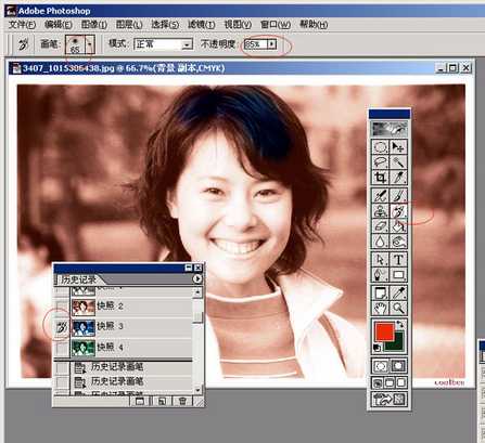 7、眼白部位用快照1恢復(fù)再稍加點藍(lán),嘴唇部位套索勾出來,羽化值選1,調(diào)紅點。眉毛用快照1不透明度調(diào)小,多來幾次。其它不再多說,歷史畫筆在交接部位要細(xì)致,將圖放大點,筆頭大小要適中,不透明度要小,反復(fù)多來幾遍,也可以交替利用兩個快照,這樣交接部位非常自然。