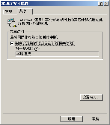 下面將設(shè)置共享。“本地聯(lián)接4”為ADSL上網(wǎng)狀態(tài)的聯(lián)接。選擇“屬性”,選擇“internet協(xié)議(TCP/IP)”,選擇“共享”,將“共享”選框打勾,“啟用此連接的internet連接共享”,將“本地聯(lián)接4”共享給“本地聯(lián)接2”,因?yàn)樗B接著我們的HUB如圖9。