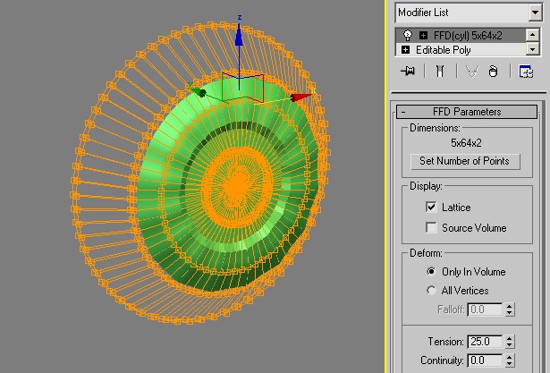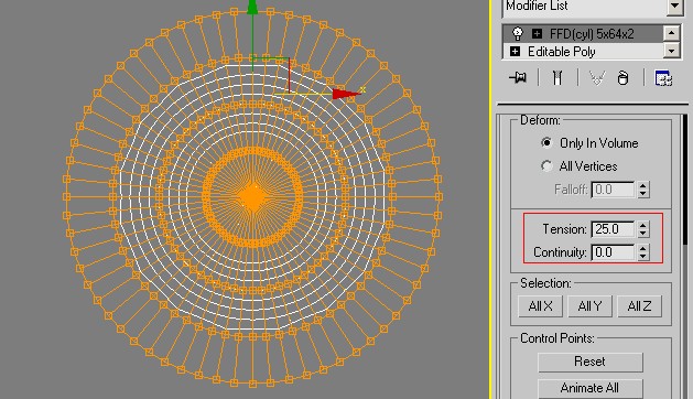 12. 查看這個(gè)對(duì)象邊的個(gè)數(shù),并賦予【FFD(Cyl)】(自由變換圓柱形工具),注意調(diào)節(jié)這里的【Continuity】(連續(xù))參數(shù),這個(gè)參數(shù)主要是為了控制變形對(duì)象的彈性。如圖XOJP—13所示。