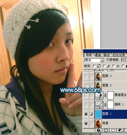 | 1、打開原圖素材,新建一個圖層,填充顏色:#33B2D3,圖層混合模式改為“柔光”,圖層不透明度改為:80%,效果如下圖。 |