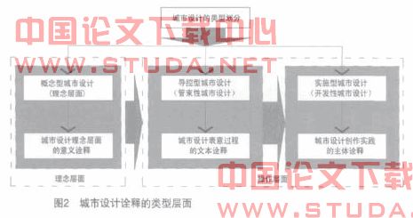 根據城市設計的詮釋特性和城市設計學科特點的相關研究,筆者認為城市設計的類型可劃分為:概念型城市設計、導控型城市設計和實施型城市設計3種,分別指涉城市設計注重形態概念、注重表意過程、注重創作實踐在城市設計各個階段不同的思維特性。概念型城市設計可稱之為理念層面的城市設計,導控型城市設計(管束性城市設計)和實施型城市設計(開發性城市設計)可稱之為操作層面的城市設計。在城市設計的詮釋過程中,它們分別表現為城市設計在類型和階段層面劃分上的不同詮釋途徑,如在理念層面的意義詮釋、在表意過程的文本詮釋和在創作實踐的主體詮釋等(圖2)。