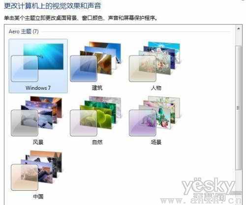 在桌面單擊鼠標(biāo)右鍵,在彈出的快捷菜單當(dāng)中選擇“個(gè)性化”即可打開(kāi)Windows 7的個(gè)性化設(shè)置窗口。默認(rèn)情況下,Windows 7當(dāng)中已經(jīng)提供了“Windows 7”、“建筑”、“人物”、“風(fēng)景”、“自然”、“場(chǎng)景”和“中國(guó)”7套不同的Aero主題,用鼠標(biāo)點(diǎn)擊任意一套主題,就可以馬上看到效果。