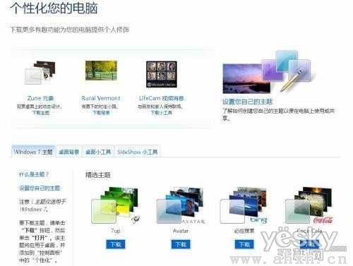 如何,夠簡(jiǎn)單吧,趕緊選一個(gè)自己喜歡的主題界面吧。什么?有朋友不喜歡這幾個(gè)主題界面,還想要更多主題包,沒(méi)問(wèn)題!點(diǎn)擊主題選擇框區(qū)域右上角的“聯(lián)機(jī)獲取更多主題”鏈接,即可打開(kāi)微軟的官方網(wǎng)站“個(gè)性化您的電腦”頁(yè)面,下載更多主題包。