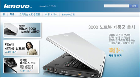 PConline在3月31日零點之后登陸聯想官方網站的韓國首頁,出現了有關“Lenovo 3000”系列的大幅宣傳圖片。而此前,聯想在韓國銷售的都是收購了IBM個人電腦業務之后的ThinkPad系列筆記本電腦。