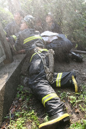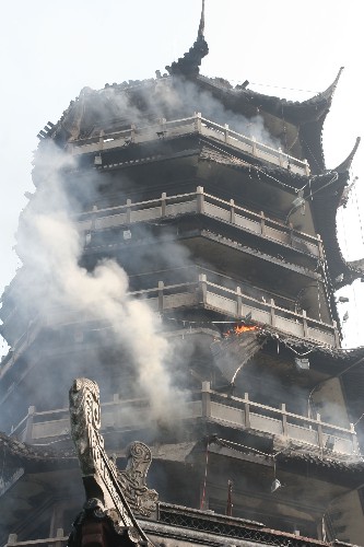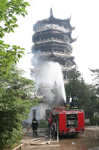 5月17日早晨,消防隊員在安徽蚌埠市張公山公園望淮塔奮力滅火。 當日凌晨3時30分左右,蚌埠市張公山公園望淮塔發生大火。當地消防官兵迅速趕赴現場,大火于7時50分被基本撲滅;馂奈丛斐扇藛T傷亡,事故原因目前正在調查中。 新華社發 (劉新義 攝)