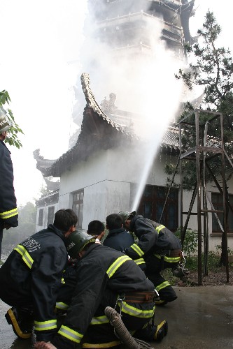 5月17日早晨,消防隊員在安徽蚌埠市張公山公園望淮塔奮力滅火。