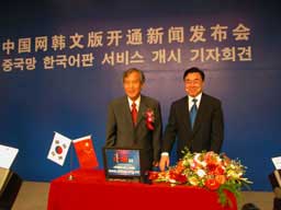 中國(guó)網(wǎng)總裁黃友義(右)和韓國(guó)明日?qǐng)?bào)集團(tuán)董事長(zhǎng)張明國(guó)共同點(diǎn)擊開通中國(guó)網(wǎng)韓文版