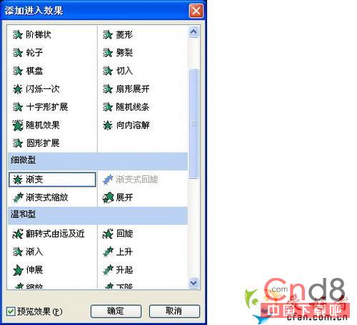 字幕“由上往下”或“由下往上”的滾動(dòng)效果可直接選取自定義動(dòng)畫(huà)中的“字幕式”效果來(lái)實(shí)現(xiàn)。首先選定對(duì)象,單擊“添加效果”按鈕,在彈出的菜單中選擇“進(jìn)入→其他效果”,在“華麗型”欄中選擇“字幕式”,最后單擊“確定”即可。